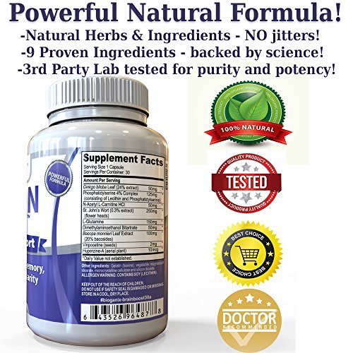 -. Title : BRAIN-BOOST Natural Brain Function Support Supplement - Best Mental Alertness Nootropic to Enhance Memory, Focus Factor, Clarity & Energy /w Ginko Biloba Leaf, St. John's Wort, DMAE, L-Glutamine