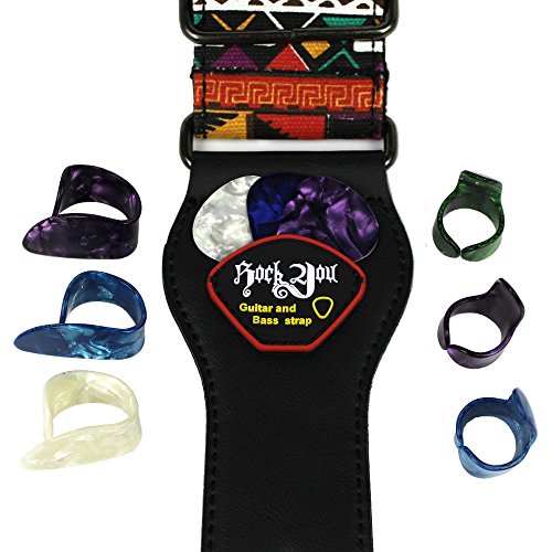 -. Title : LK-SP.R.Ing Guitar Strap with Pattern Leather Ends Guitar Picks Pocket Strap for Acoustic Bass Guitar,Including Finger Thumb Pick Set,Guitar Pick Set
