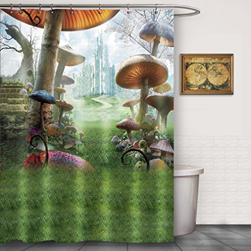 Fantasy Mushroom Wonderland Shower Curtain Sets Enchanted Fairytale Forest Scenery Mystic Euro Castle Kids Bathroom Decoration Waterproof Mildew Resistant-Green Gray Beige Red (70"Wx70"L)