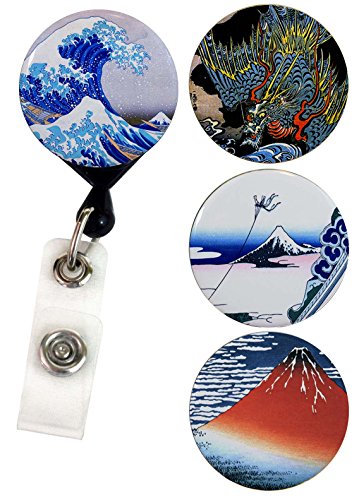 Buttonsmith Hokusai Retractable Tinker Reel Badge Reel with Rotating Alligator Clip and Swappable Tinker Tops featuring Great Wave - Made in the USA, 1 Year Warranty