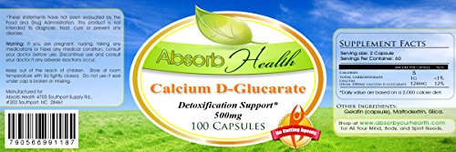 -. Binding : Health and Beauty -. Brand : Absorb Health -. EAN : 0790566991187 -. Feature : * Calcium D-Glucarate Detoxifies the Body * Free U.S. Domestic Shipping On Orders Over $25 * Money Back Guarantee, One Day Handling * Use Coupons to Save on Our Other Products * Manufactured in GMP-Compliant Facilities -. IsAdultProduct : 0 -. IsAutographed : 0 -. Label : Absorb Health -. Manufacturer : Absorb Health -. MPN : CalD -. PackageQuantity : 1 -. PartNumber : CalD -. ProductGroup : Health and Beauty -. ProductTypeName : HEALTH_PERSONAL_CARE -. Publisher : Absorb Health -. Studio : Absorb Health -. Title : Calcium D-Glucarate | Detoxifies Excess Estrogen | 500mg 100 Capsules -. UPC : 790566991187