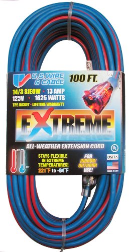 US Wire 98100 14/3 100-Foot SJEOW TPE Cold Weather Extension Cord Blue with Lighted Plug