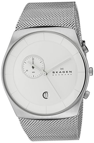 Dress watch in stainless steel featuring tonneau-shape case with round white dial, 30-minute subdial, and date window at 6 o^^clock