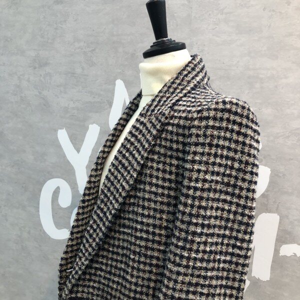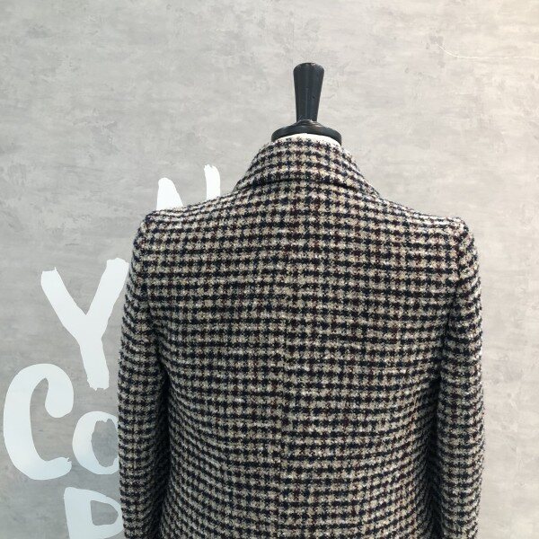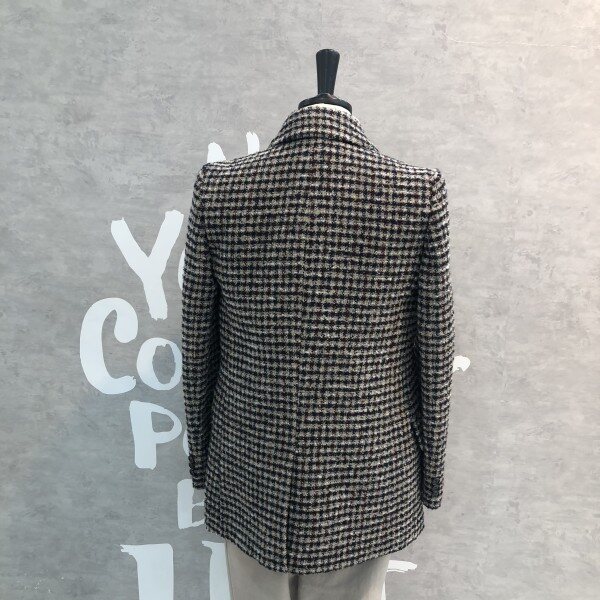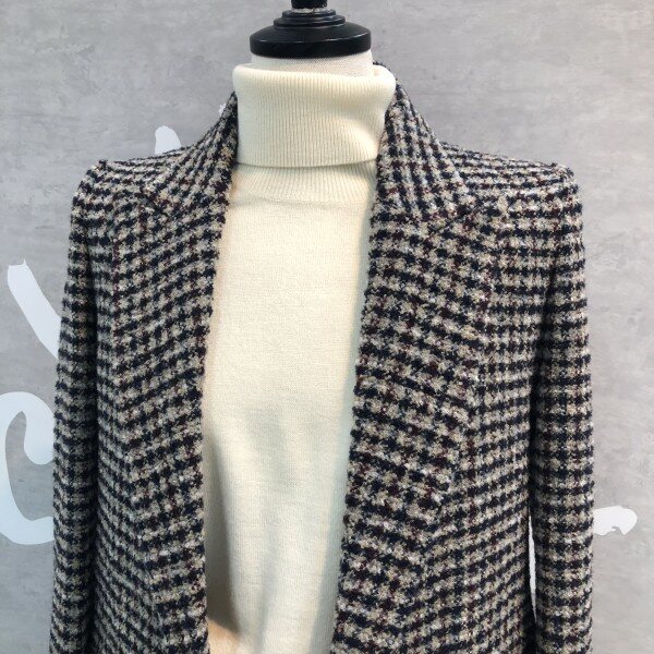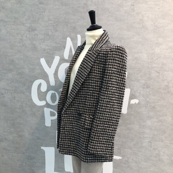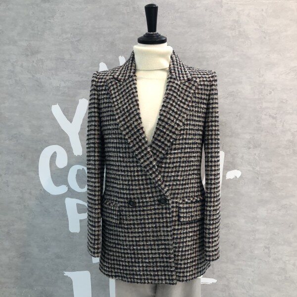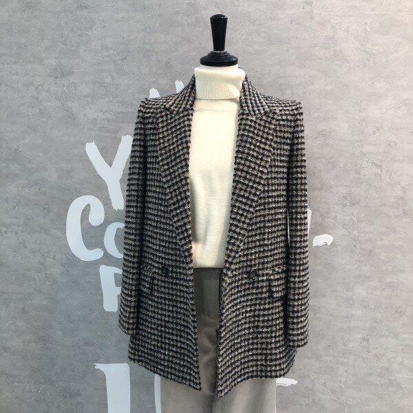 피그드 라펠의 더블버튼 실루엣에 체크패턴이 클래식한 무드의 재킷입니다
