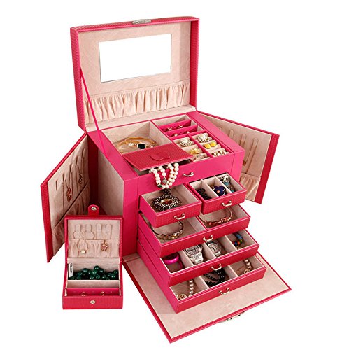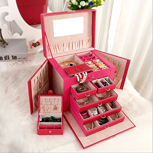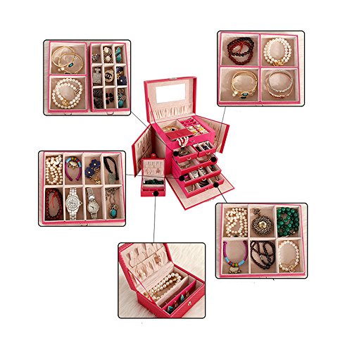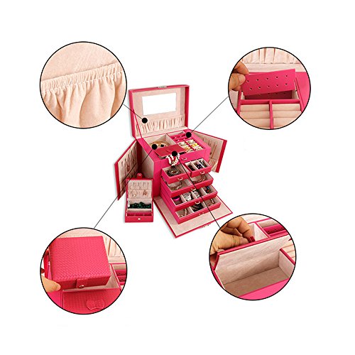 Unisex Leather Jewelry Organizer, Five Drawers Storage with Mini Drawers, Earing Ring Bracelet Holder, Necklace Hook, Door Mirror Cosmetic Box, Rose Red