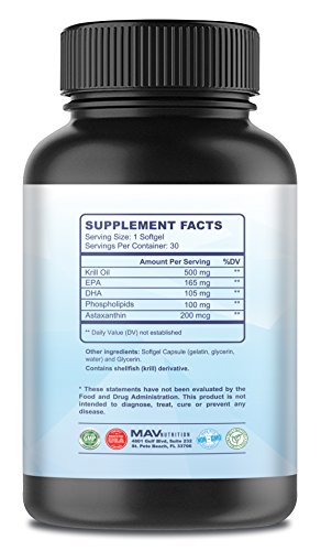 Studio : MAV Nutrition LLC Publisher : MAV Nutrition LLC Binding : Health and Beauty Product Description Antarctic Premium Krill Oil Formula contains revitalizing omega-3 fatty acids such as DHA and EPA, as well as the powerful antioxidant, Astaxanthin, that will help: Guard against UV-induced skin damage Enhance mood, concentration and focus Maintain cardiovascular and heart health Protect from disease causing free radicals Aid with the reduction of inflammation and rheumatic diseases Antarctic Premium krill oil supplements contain heart healthy omega-3 fatty acids, DHA and EPA. But krill promotes better fatty acid absorption and delivery than traditional fish oil. Krill oil also contains naturally occurring Astaxanthin, a highly potent antioxidant that works to protect against disease causing free radicals. 0