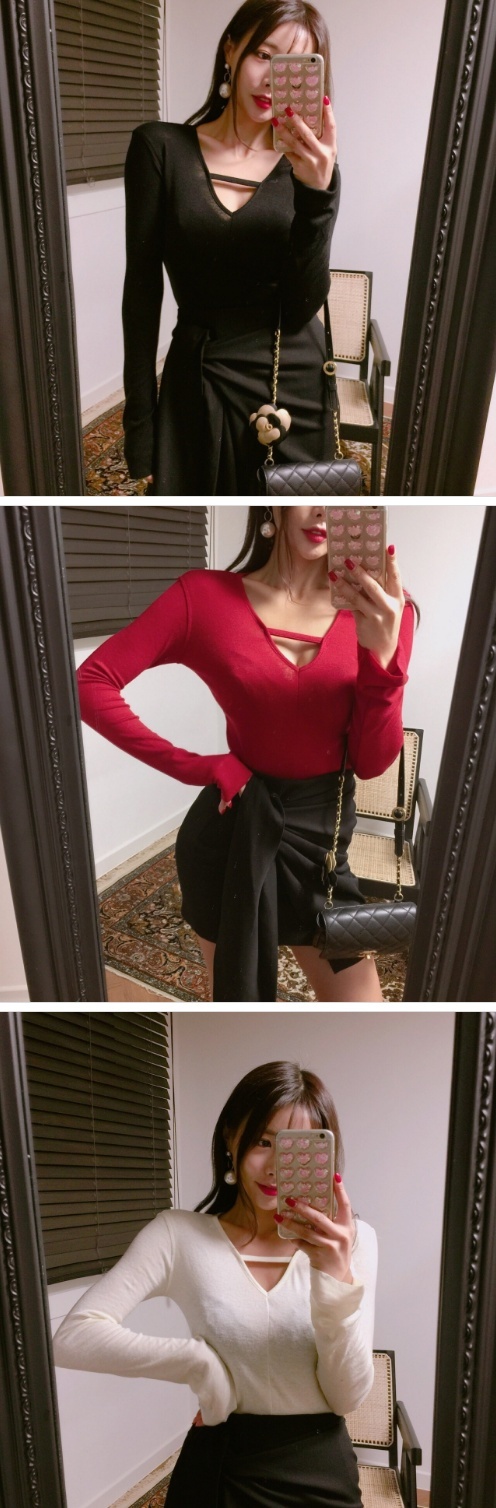 Women`s Strap Accents Deep V-neck T-shirts Black Red Ivory