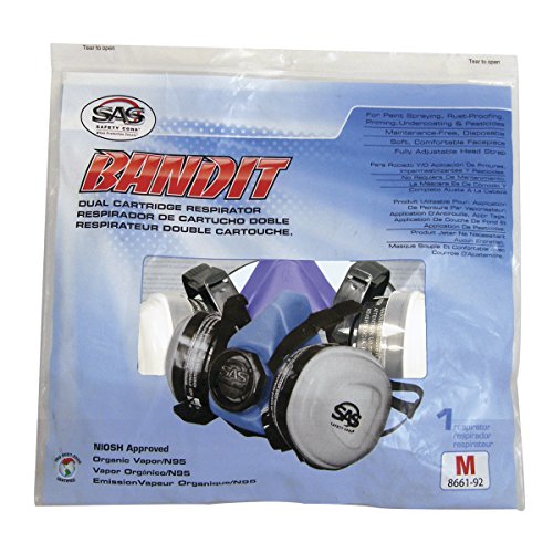 -. Binding : Tools & Home Improvement -. Brand : SAS Safety -. Feature : Made from soft blue thermoplastic elastomer (TPE) / Face piece is supple form fitting and can be worn for hours / Head strap designed for less tension for secure fit / Cartridges designed for better vision and balance -. Label : SAS Safety -. Manufacturer : SAS Safety -. Model : 8661-92-PARENT -. NumberOfItems : 1 -. PackageQuantity : 1 -. ProductGroup : Home Improvement -. ProductTypeName : TOOLS -. Publisher : SAS Safety -. Studio : SAS Safety -. Title : SAS Safety Bandit Half Mask Respirator