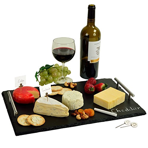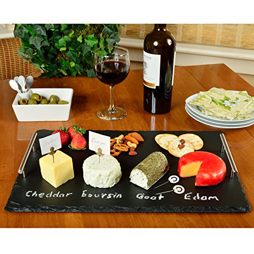 Handcrafted stylish upscale 1/4" thick natural slate board treated with food grade mineral oil - includes 2 pcs of soapstone chalk and 4 cheese markers