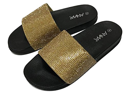 Product DescriptionA pair of Rhinestone slide sandals , front strap with rhinestone accents, an open toe, and a low heel.0