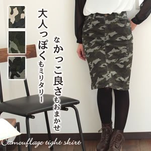 -. Feature : 【人気のカモフラ柄スカート】ピタッとフィット感のあるストレッチ素材で履き心地も楽々な今季旬のミディアム丈カモフラ タイトスカートです。かすれた感じでユーズド感のある迷彩柄はミリタリーなカジュアル格好いいコーデもおまかせ!! / 【タイトなのに動きやすいのが魅力!】バックウエスト部分がゴム仕様になっているのも嬉しいポイント!!ストレッチが効いているのでタイト目だけど動きやすい!【オールシーズン活躍してくれるスグレモノ】薄手のツイル素材なのでロングシーズン活躍してくれるボトムスです。 / 【簡単にこなれスタイリング完成!】ひざ丈なので大人カジュアル コーデにオススメなスカートです♪ma-1を羽織ってとことん辛口にしたり、甘めで可愛いトップスを合わせれば甘辛MIXコーデも簡単に仕上がります!