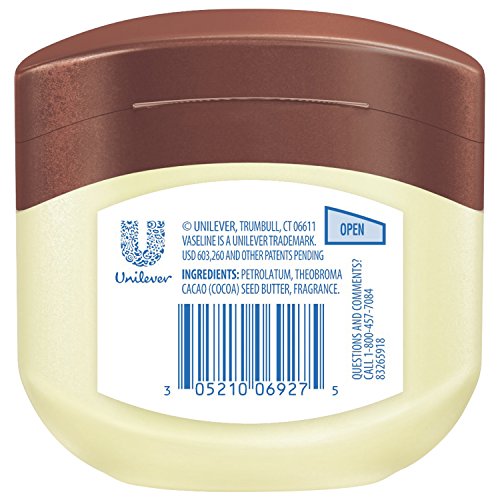 Vaseline Jelly Cocoa Butter This formula works to help heal dull, dry skin and give skin a radiant, healthy look. Vaseline Petroleum Jelly has long been used to help heal dry skin and is effective at locking in moisture. Our Vaseline Jelly Cocoa Butter combines the dry skin healing benefits of Vaseline Jelly, with cocoa butter, which is known to nourish your skin. Vaseline Jelly forms a protective barrier, to seal in moisture deep within the skin’s surface layers and to enhance the skin’s natural barrier recovery. With its moisturizing properties, Vaseline Petroleum Jelly Cocoa Butter is great for tackling dull, dry skin. This product also is made with cocoa butter, which is known to be a great moisturizer, especially for particularly rough areas like elbows, knees, and heels. Simply apply Vaseline Jelly Cocoa Butter daily to deeply condition, relieve, and rejuvenate dry skin. Gentle on Skin Vaseline Jelly with Cocoa Butter isn’t just good for dry skin; it’s also gentle on skin. Vaseline Petroleum Jelly Cocoa Butter is made with triple-purified petroleum jelly. It has also been dermatologist tested and is non-comedogenic, meaning it won’t clog your pores. These factors make it perfect for daily use. The convenient, recyclable, flip cap jar makes it easy to access the moisturizing power inside with just one hand. Choose Vaseline Petroleum Jelly Cocoa Butter and you can maintain smooth, glowing skin all year round.Feature