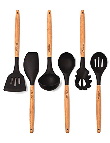 -. Feature : ECO-FRIENDLY RENEWABLE BAMBOO HANDLES: Ergonomic and tapered handles for comfortable and safe grip; **Care Instructions**: HAND WASH ONLY. **Do Not wash in dishwasher as natural bamboo does not withstand the heat and pressure of dishwashers** Silicone head NOT designed to be pulled apart from bamboo handle. / PERFECT FOR ENAMELED POTS, CERAMIC AND ALL NON-STICK COOKWARE: Silicone heat resistant to 480 degrees F; FDA approved, BPA free. / STRONG AND DURABLE DESIGN: Silicone reinforced with sturdy nylon core and high-gauge steel connector for heavy duty cooking tasks / 6 PC KITCHEN TOOL SET: Soup Ladle, Slotted Spoon, Solid Spoon, Slotted Turner, Large Spatula, Pasta server / LIFETIME GUARANTEE: We sell products that last. Our rock-solid guarantee means we'll replace the products if there's ever a problem.