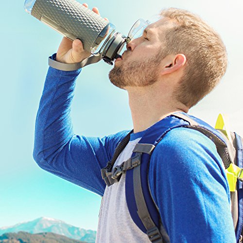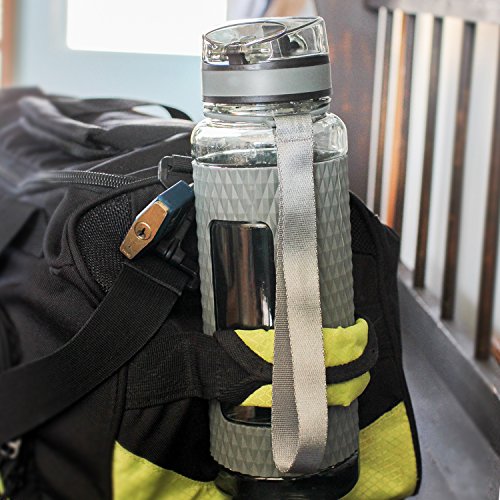 WATER BOTTLE WITH SILICONE GRIP AND SPORTS STRAP: Featuring a leak free, flip top lid and easy to drink nozzle our water bottle guarantees you a spill free workout, bike ride, camping trip, or commute. The easy grip silicone sleeve gives you firm grasp on the bottle while giving added insulation and protection. Sport strap lets you attach our water bottle to a backpack, travel bag, or bicycle.