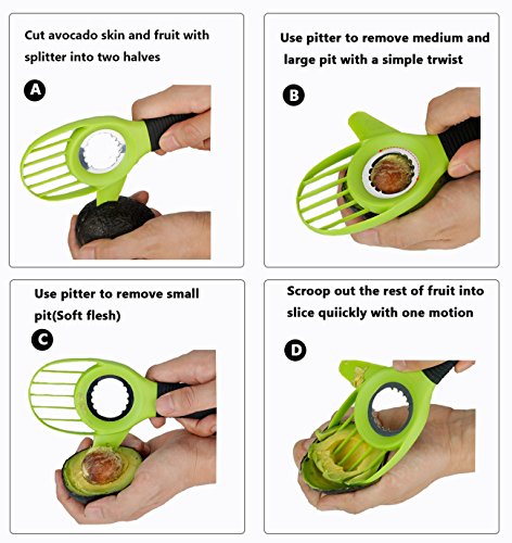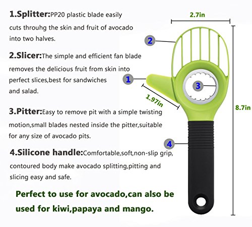 3-in-1 avocado tool ,Cutter/Slicer/Pitter/Corer/Divider/Scooper allows you to cut avocados easily and safely.