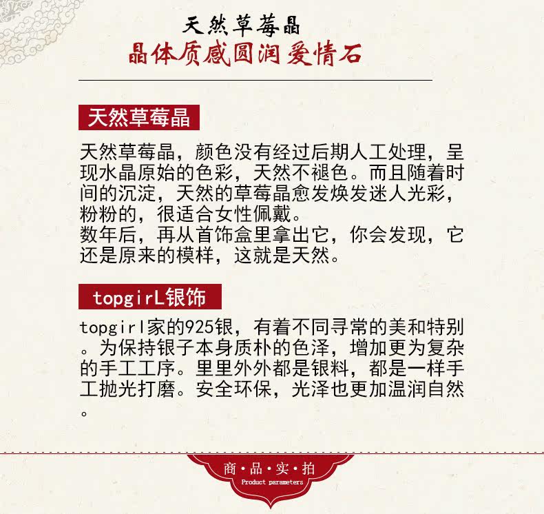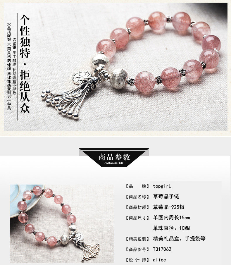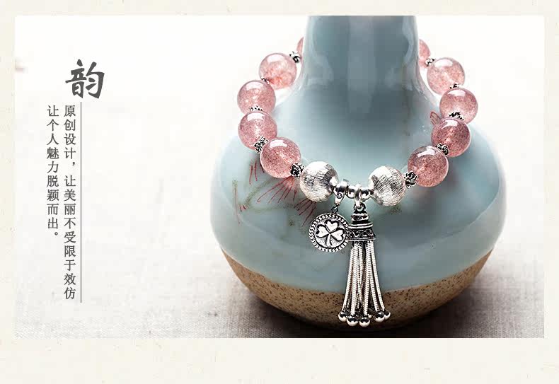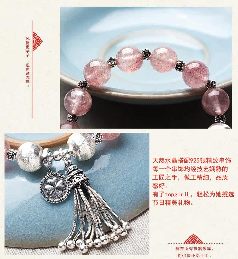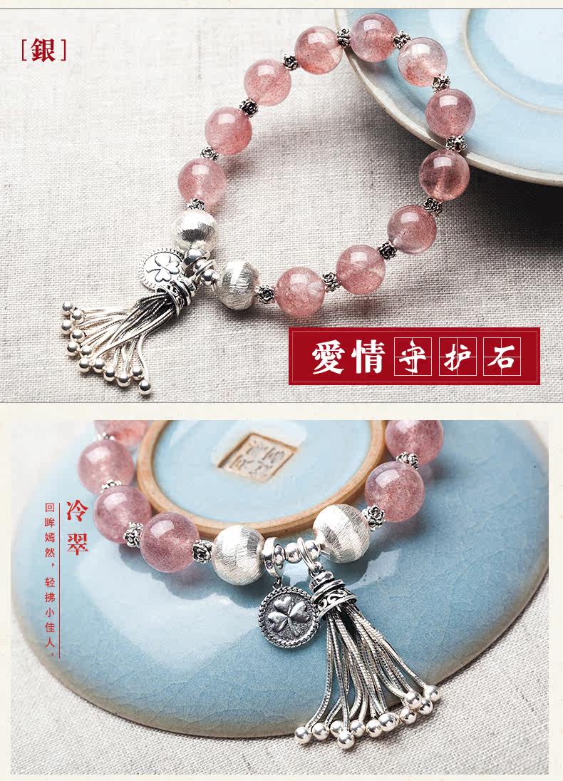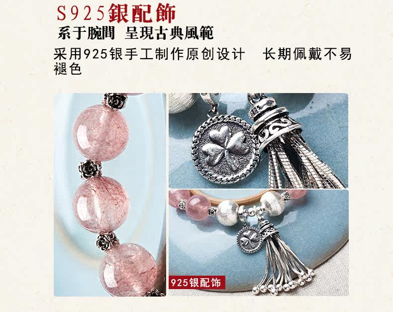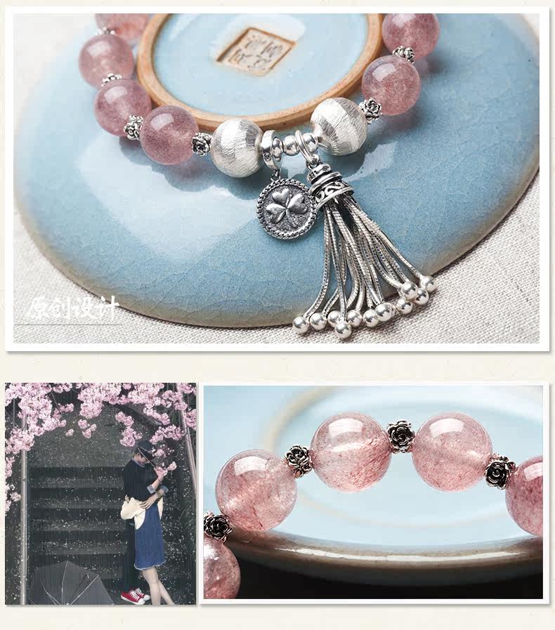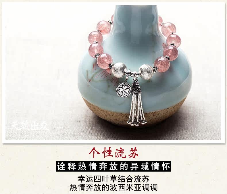 天然草莓粉水晶手链女四叶草银饰流苏手串招桃花 礼物