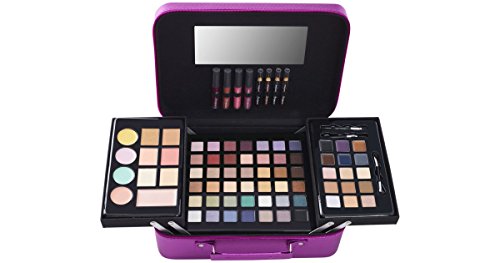 42 Eyeshadows in matte light pink, shimmer light pink, shimmer rosewood, shimmer plum, shimmer periwinkle, matte purple, matte light blush, shimmer copper, matte rust, shimmer light blush, shimmer blush, shimmer rose, shimmer chocolate, matte bone, shimmer beige, matte khaki, shimmer khaki, matte camel, matte tan, matte chocolate, shimmer champagne, shimmer peach, matte light peach, shimmer cream, shimmer gold, matte buff, shimmer bronze, matte light yellow, shimmer light green, shimmer olive, matte green, shiner white, shimmer grey, shimmer teal, matte white, shimmer light blue, shimmer blue, shimmer navy, matte taupe, shimmer taupe, matte black (0.03 oz each) 6 Gel Eyeliners in black, purple, bronze, brown, navy, charcoal (0.02 oz each) 4 Color Correcting Concealers in yellow, lavender, green, pink (0.05 oz each) 4 Eyeliner Pencils in Blackout, Plum, Denim, Mink (0.02 oz each) 3 Brow Powders in taupe, medium brown, deep brown (0.03 oz each) 3 Glitter Top Coats in silver, bronze, rose gold (0.03 oz each) 2 Eyeshadow Primers in champagne, nude matte (0.02 oz each) 2 Bronzers in shimmer, matte (0.08 oz each) 2 Blushes in coral, nude pink (0.08 oz each) 2 Highlighters in gold, peach (0.08 oz each) 2 Matte Lip Creams in Stirring (deep plum matte), Courageous (medium bluish brown) (0.03 oz each) 2 Color Rush Lip Glosses in Brigitte (medium blue pink), Elizabeth (medium plum with slight shimmer) (0.03 oz each) 1 Cream Highlighter in pink (0.08 oz) 1 Brow Wax (0.02 oz)