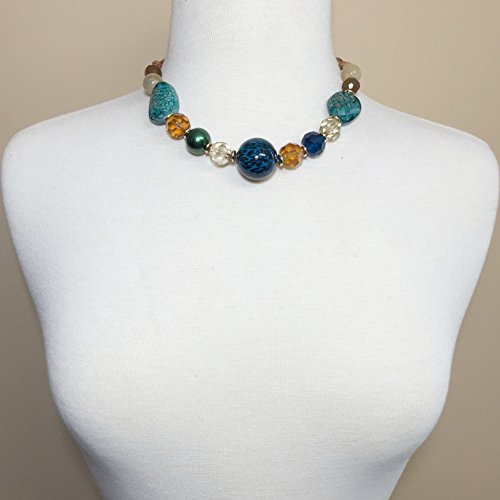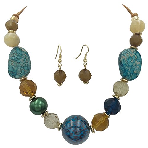 Multi Color Mixed Beads Statement Necklace & Dangle Earrings Set (Blue Center)
