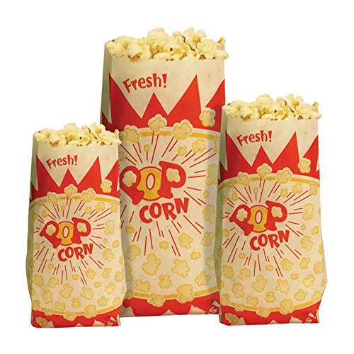 -. Feature : Timeless open-top popcorn bags / Classic red and yellow coloring / Bag design subject to change / Includes 1000 bags / Proudly made in the USA