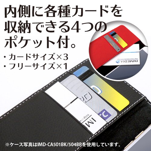 Four card size pockets with various cards and business cards can be stored.
