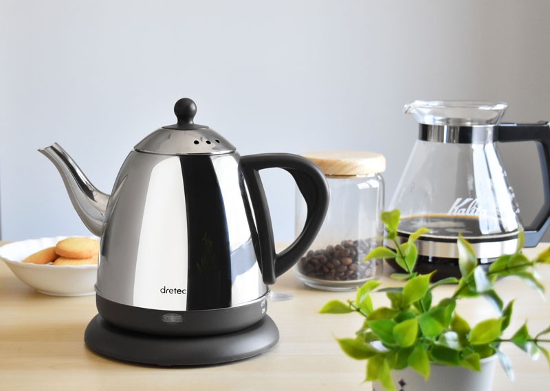スイッチを押して、沸いたら自動的に電源が切れる!サイズ:幅233×奥行150×高さ170mm本体重量:577g材質:本体・フタ/ステンレス、ハンドル/ポリプロピレン、給電スタンド/ポリプロピレン原産国:中国電源:AC100V 50/60Hz消費電力:900W