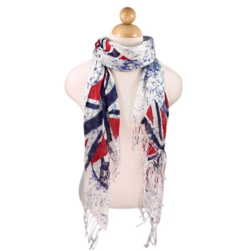 Product DescriptionPremium United Kingdom Flag Print scarf with peace signs. Soft to touch and comfortable to wear. High quality, vintage look, and always in style. Size: 66" x 22" 3.5" fringe on each end.0