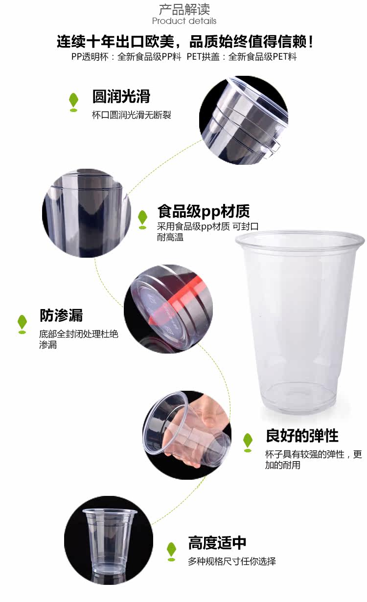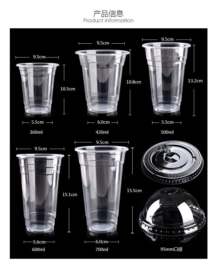 420ml:杯口直径9.5cm, 杯底直径6.0cm, 杯身高度10.8cm 500ml:杯口直径9.5cm, 杯底直径5.5cm, 杯身高度13.2cm 600ml:杯口直径9.5cm, 杯底直径5.6cm, 杯身高度15.1cm 700ml:杯口直径9.5cm, 杯底直径6.0cm, 杯身高度15.5cm 95mm口径 PET拱盖/平盖:配本店PP杯,口径9.5cm 温馨提示:PET盖子最高耐热温度为50度以下。 |