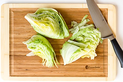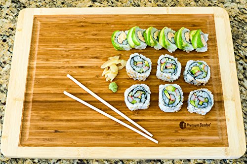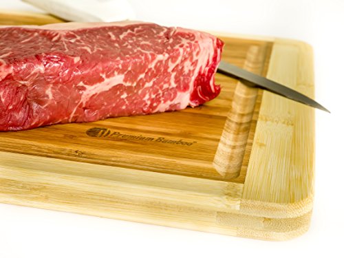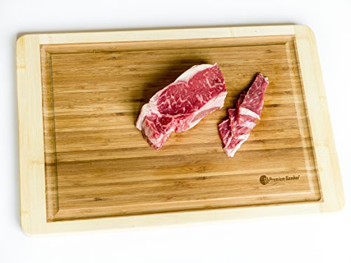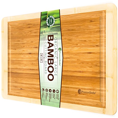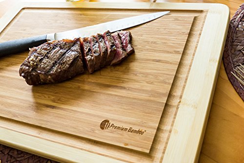 - EXTRA-LARGE Cutting Board measures 18” x 12” x0.75”, and features handy carrying notches at both ends. The Premium Bamboo Cutting Board handles all of your home kitchen chopping and slicing tasks.