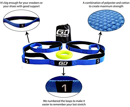 - EASY TO USE - The strap is designed with 10 loops and it is big enough for your shoes or snickers , the stitches are stronger and more durable so no matter how much you weigh,it will carry the load. The numbers on the strap will help you to remember where exactly you've reached during your stretch so you can keep up with your improvement graph. The beauty of this strap is that you don’t need to tie it to any object. You can do it by independently, any time any where.