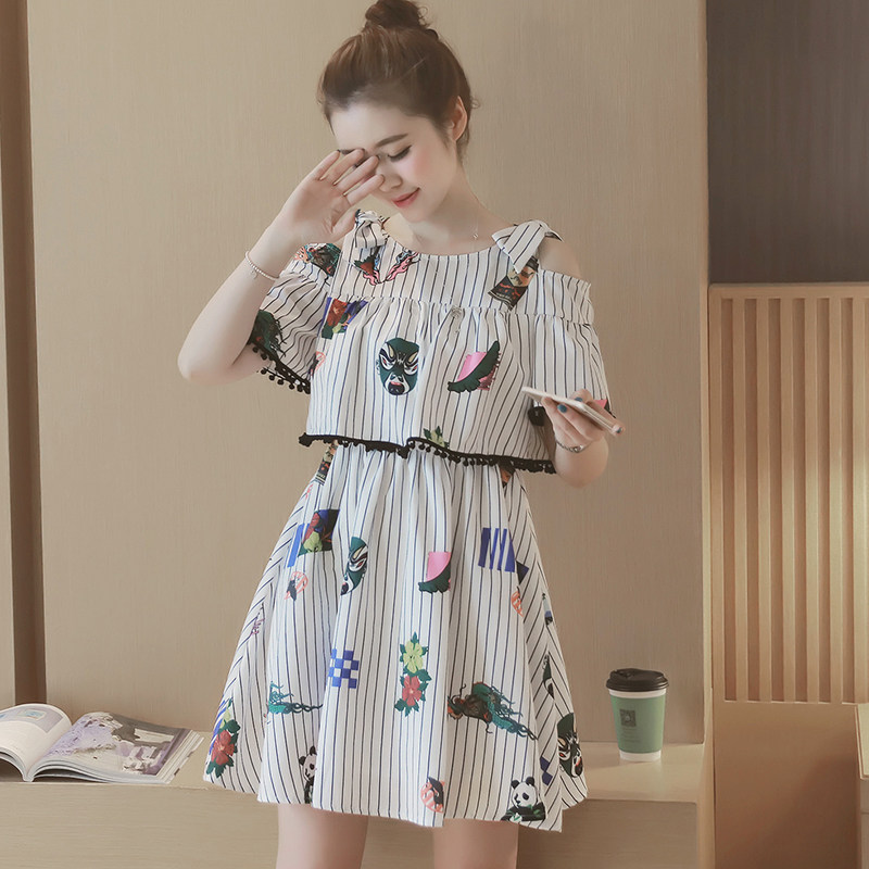 | 名称 | 甜美卡通印花系带露肩短袖条纹连衣裙 |