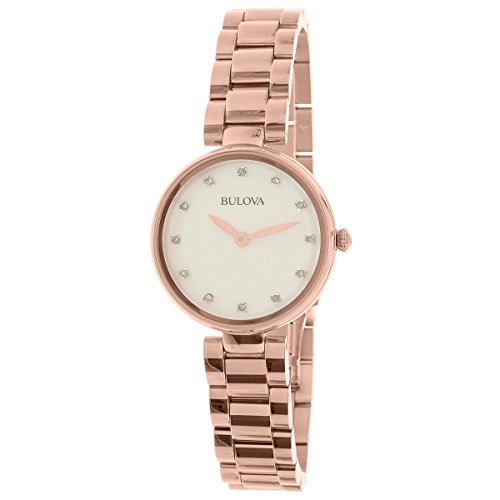 Bulova 96A185 Diamond women's watch features a 27mm wide and 6mm thick rose gold ion plated solid stainless steel case with a fixed bezel and textured push-pull crown. Bulova 96A185 is powered by quartz movement. This beautiful watch also features sharp looking white mother of pearl dial with rose gold tone luminous hands and 12 diamonds accented index hour markers, scratch resistant mineral crystal and water resistant to 30 meters. Bulova 96A185 is equipped with a 12mm wide rose gold ion plated solid stainless steel bracelet with a deployment push button clasp. Bulova 96A185 women's Diamond MOP dial rose gold steel watch is brand new and comes in an original Bulova gift box and is backed by a 3 year limited warranty.Feature