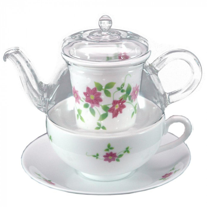 | 1人用ティーポットとティーカップがセットで、カップとポットが重なる形状が特徴の「ティーフォーワン」。ガラスのティーポットには陶磁器の茶こしをセットしました。ガラスの透明性と陶磁器のあざやかな絵柄が、上品でおだやかな時間を演出します。おもてなしやギフトにも最適☆ |