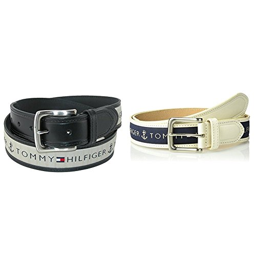Logoed-ribbon belt with leather accents and single-prong buckle