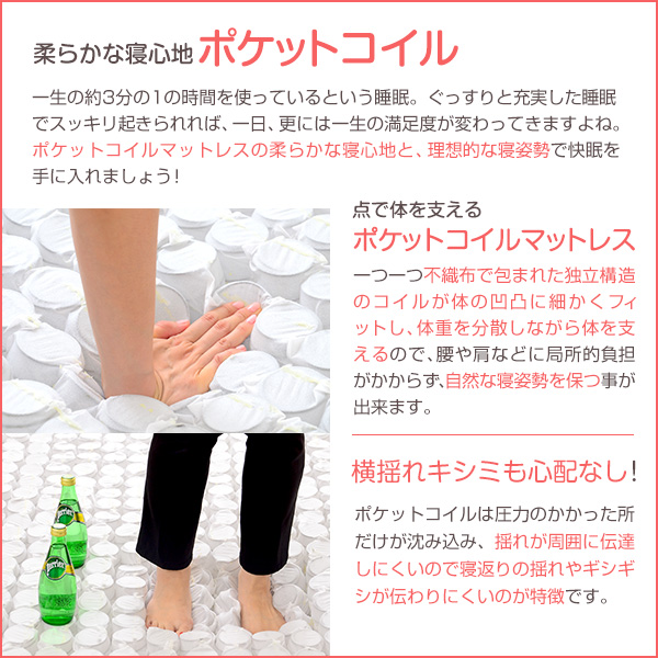 (ベッド)貼り材:ポリエステル クッション材:ポケットコイル、ウレタンフォーム、フェルト、不織布 脚:木製脚15cm