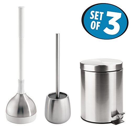 mDesign Bathroom Accessory Set, Plunger with Holder, Bowl Brush with Holder, Step Trash Can - Set of 3, Brushed Stainless Steel