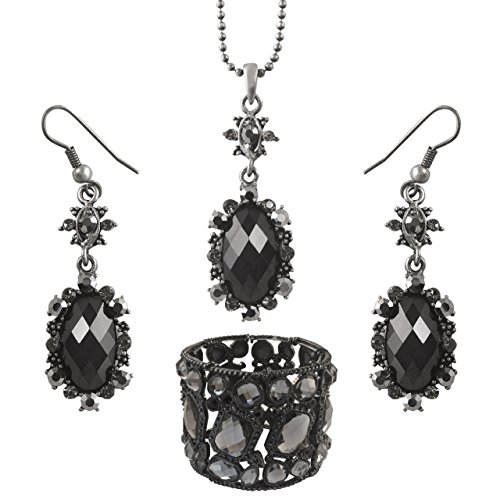 -. Binding : Jewelry -. Brand : Crystal Elegance UK -. Department : womens -. Feature : Exceptional P.R.Ice and quality. / Beautiful elegant flower design black crystal drop set - 40cm chain, 4cm pendant drop, 4 cm earring drops. / Rhodium plated encrusted with black opaque oval crystal central piece. Comes with crystal faced stretch barcelet 5cm wide. / Comes with matching black earrings that measure 4cm length drop down length / Extremely light and comfortable to wear - gift boxed. -. Label : Crystal Elegance UK -. Manufacturer : Crystal Elegance UK -. Model : spblackset1386 -. MPN : spblackset1386 -. PartNumber : spblackset1386 -. ProductGroup : Jewelry -. ProductTypeName : FASHIONNECKLACEBRACELETANKLET -. Publisher : Crystal Elegance UK -. Studio : Crystal Elegance UK -. Title : Elegant Black Retro / Gothic Design Crystal Drop Necklace Earrings Bracelet Set for Her