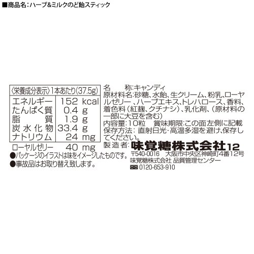 原材料:砂糖、水飴、生クリーム、粉乳、ローヤルゼリー、ハーブエキス、トレハロース、香料、着色料(紅麹、クチナシ)、乳化剤、(原材料の一部に大豆を含む)