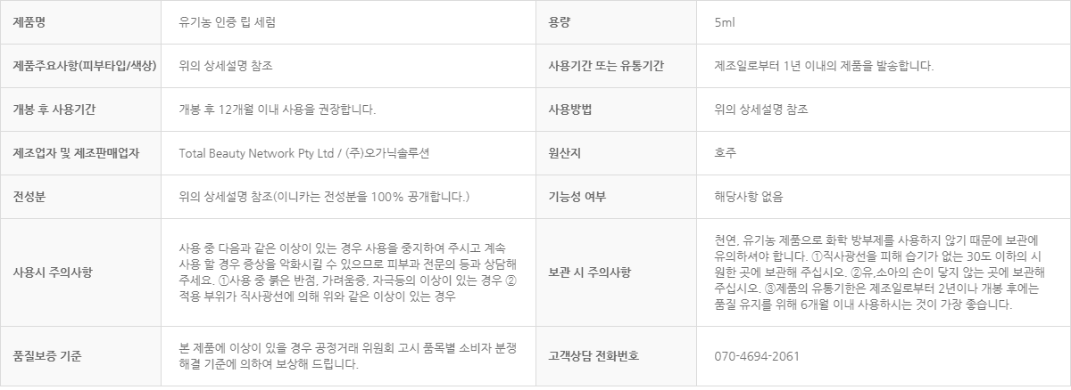필수 지방산, ** 방지제 및 모이스쳐로 알려진 유기농 ** 시벅썬의 풍부한 영양과 보습 그리고 비타민C, 비타민E가 풍부한 유기농 성분들의 시너지로 하루종일 입술에 영양을 공급하고 수분막을 형성하여 입술의 **과 자연스러운 입술색을 되찾아 주는 프리스티지 립 세럼입니다.