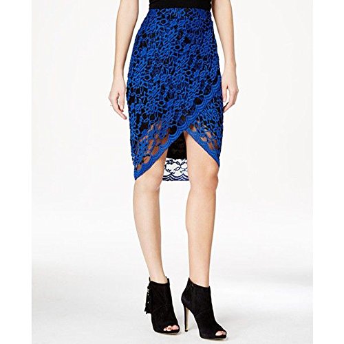 Product Description Floral-patterned lace in electrifying blue is styled into a faux-wrap silhouette on this pencil skirt from Material Girl. Scalloped trims supply the front and hem with chic asymmetry. 0