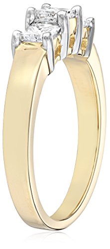 Celebrate your past, present, and future together with this romantic three-stone diamond ring, made from rich, durable 14 karat gold. Three princess-cut diamonds (1/3 cttw) are grouped closely together in secure prong settings to create this elegant style. A polished gold band, with clean, simple lines and squared edges, completes the design. This ring is available in your choice of white or yellow gold and can be resized up or down by 1/2 size.Feature