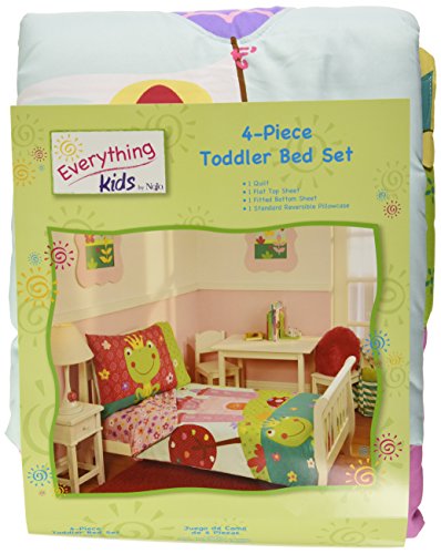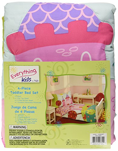 A magical castle, playful frog prince, and bright colors make the Everything Kids fairytale 4 piece Toddler bedding set a sure favorite of your little princess. The frog prince is searching for his princess in the Everything Kids fairytale 4 piece toddler bedding set. Made from extra soft microfiber fabrics, the convenient 4 piece set includes a printed comforter, flat top sheet, fitted bottom sheet, and a printed pillowcase. Designed to fit a standard toddler size bed, with a 28 x 52" mattress.Feature