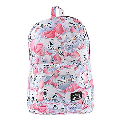 Arguably the cutest backpack ever! Featuring Marie of the Aristocats, the girly girl kitten star of the Disney animated movie. Wide, double zipper main compartment opening. Laptop pocket. Roomy front exterior zipper pocket. Padded adjustable shoulder straps that can be extended to 30 inches. Rubber exterior Disney Loungefly label. Made of heavy woven nylon which makes it easy to wipe clean. Main compartment lined in grey and white pinstripes. Measures 18 inches tall, 12 inches wide, and 5 inches deep. Cruelty free, man-made materials, suitable for kids and adults.Feature