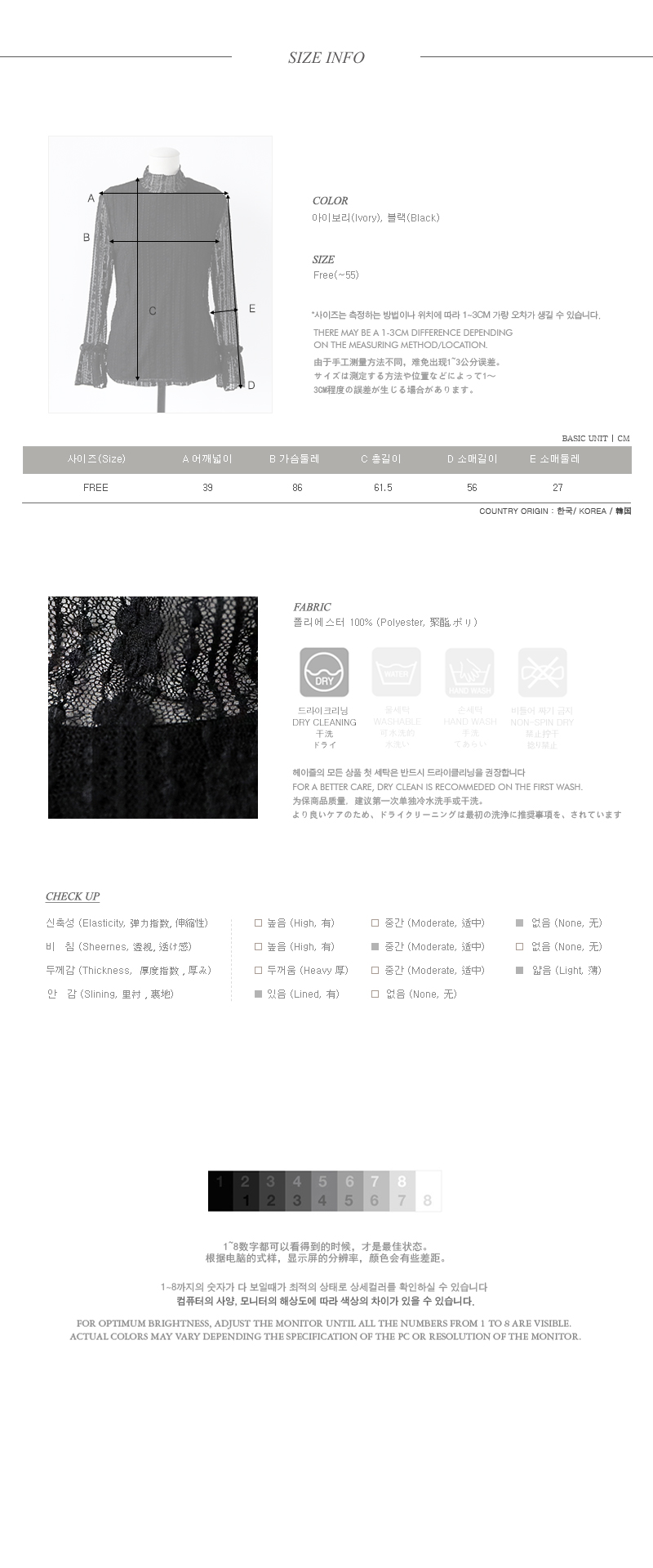 봄에 알맞은 레이스소재로사랑스러운 분위기 연출이 가능한블라우스 아이템이예요~넥과 소매를 제외한 바디라인에 부분 안감 처리로 이너 아이템을 따로 착용하지 않아도 간편하게 스타일링 연출이 가능하답니다~^^소매의 러플 디테일과 전체적인 레이스소재로 한층 더 사랑스러운 코디를 할 수 있어요스키니,스커트와 함께 매치해도 부담없이 페미닌적인 분위기연출이 가능하답니다~^^