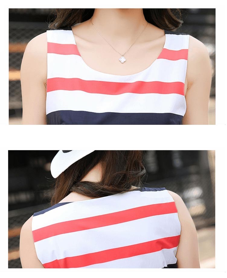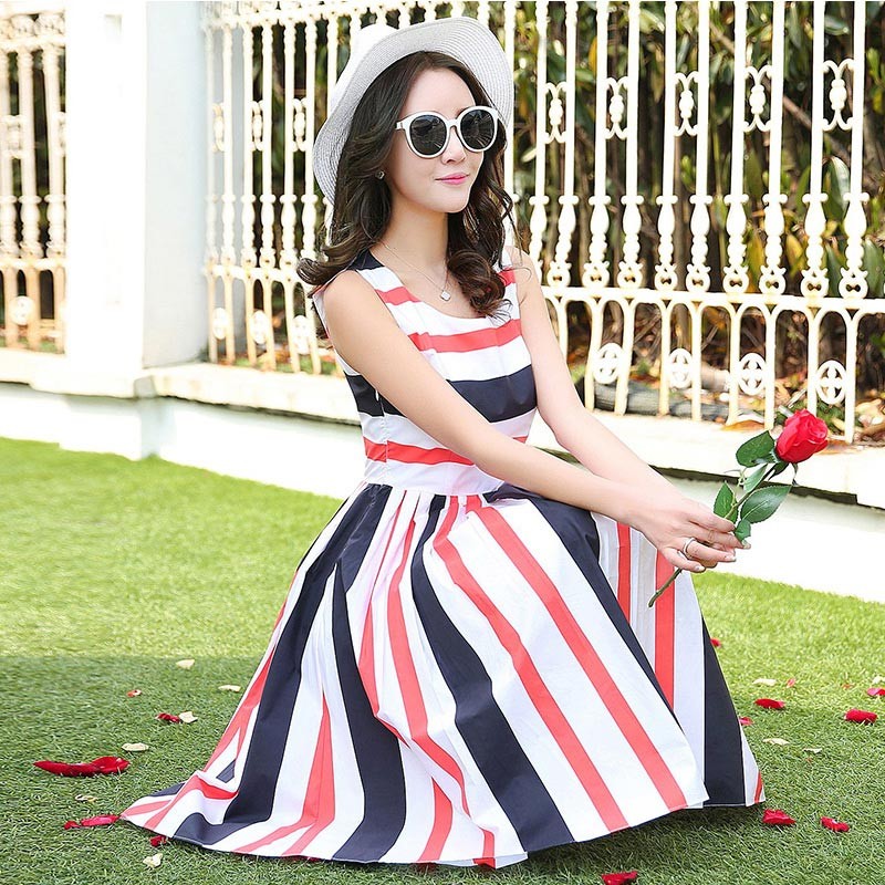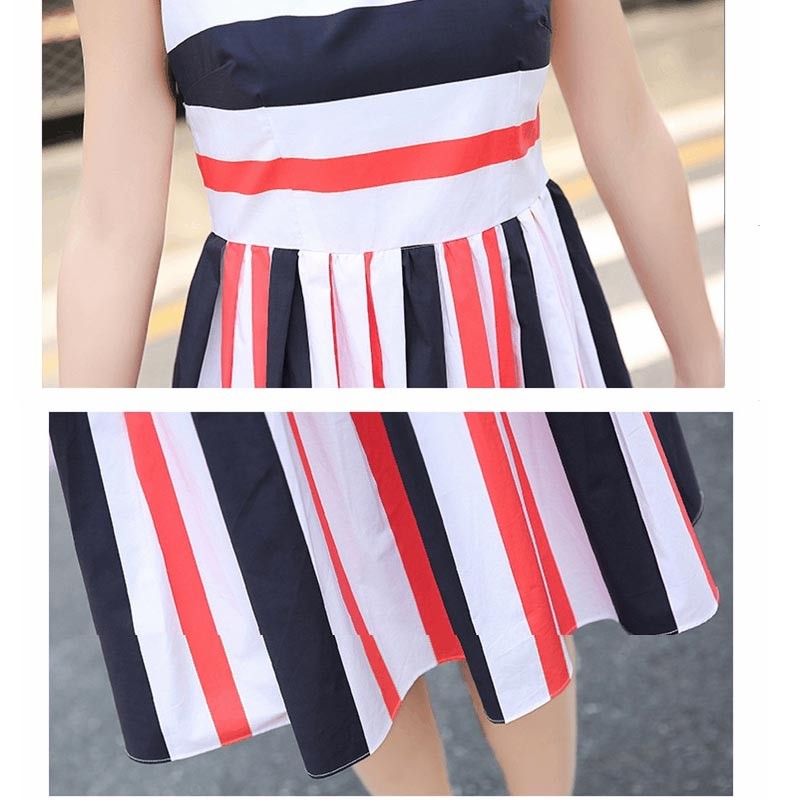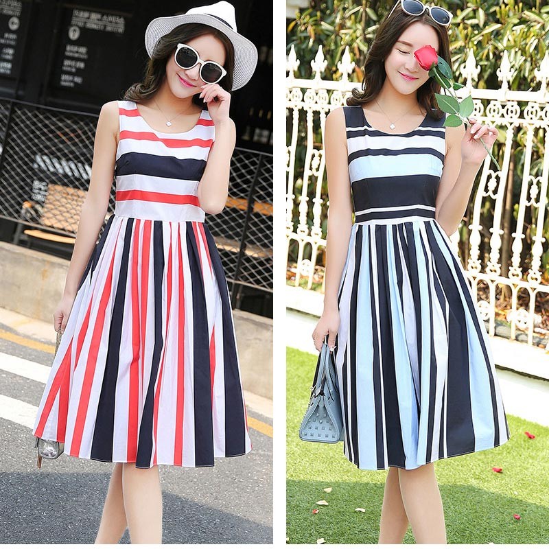 レッド系ストライプとブルー系ストライプのノースリーブひざ丈ワンピです♪