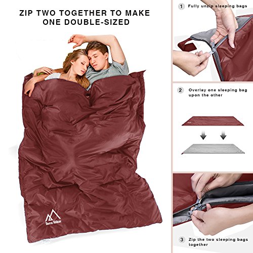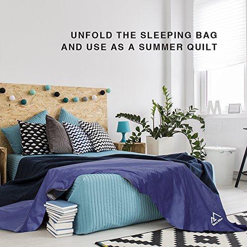 Versatile Sleeping Bag The generous 6.4 ft length accommodates most adults. With an unfolded size of 33.54 x 76 in, the sleeping bag can also be used as a summer quilt. What's more, you can zip two single sleeping bags together to make a double-sized cocoon (76 x 67 in). Now you can enjoy an embrace from your loved one even in the outdoors.