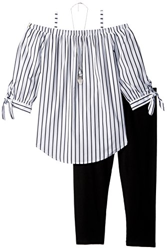 White/black stripe mid sleeve off shoulder top with elastic neckline, tie sleeves, choker and legging