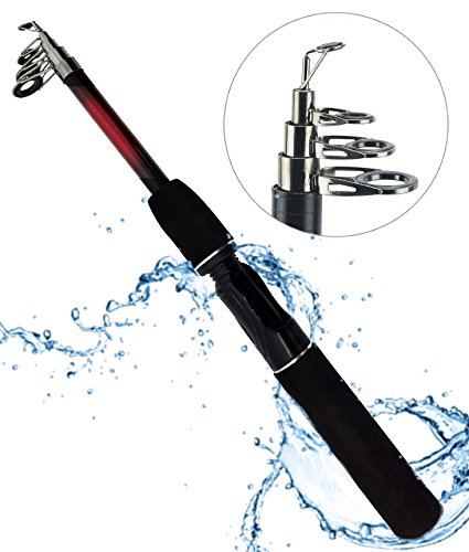 Telescopic Fishing rod that is strong and bendable. Colors are red and black. Great for fishing in rivers or boats. Easy to compact and store for later.