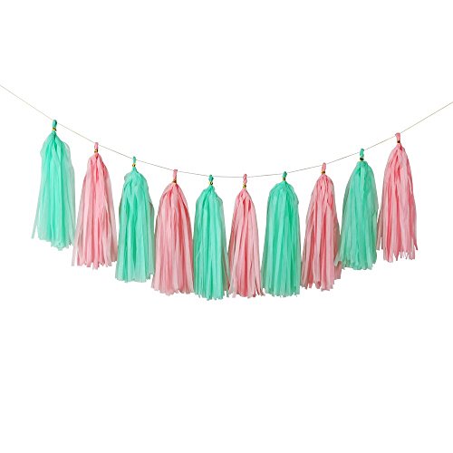 TASSELS x 10pcs Material: 17gsm paper. Color: pink, green. Size: 12 x 35cm, each color comes with 5pcs. BALLOONS x 20pcs Material: 3.2g latex. Color: pink, green, white. 3 Size Color: 12'/30cm, Pink x 7pcs, green x 7pcs, white x 6pcs.