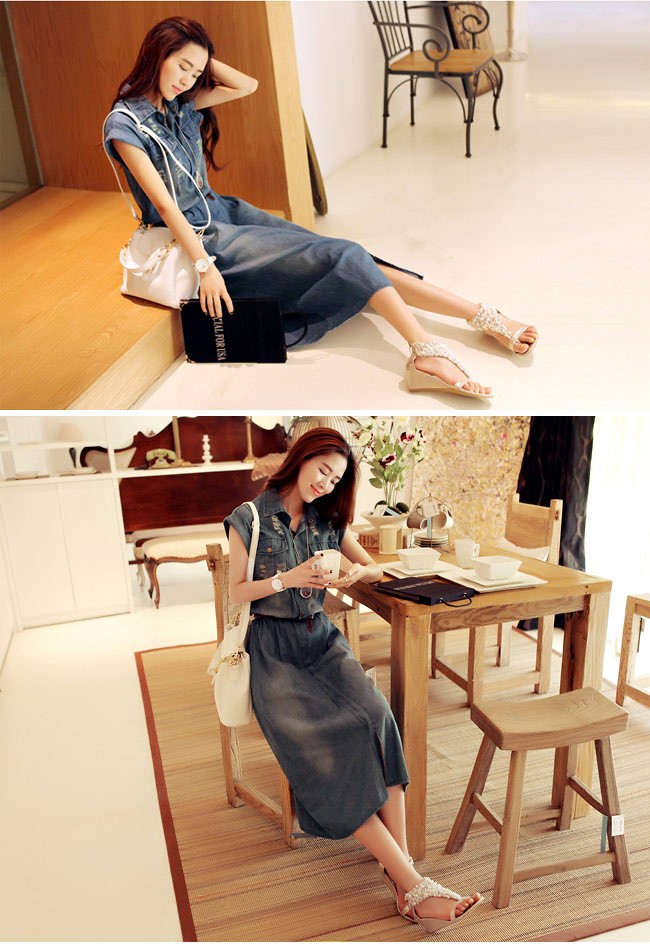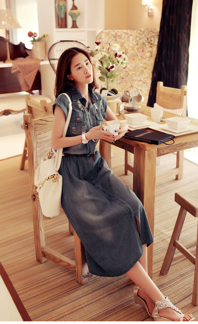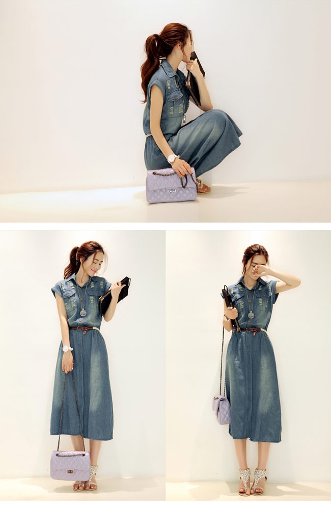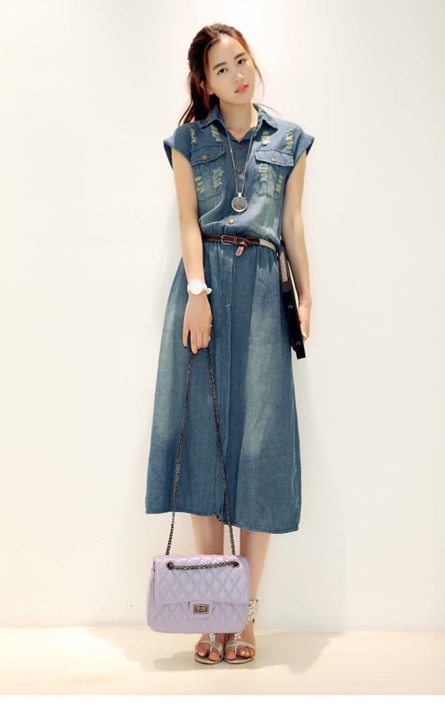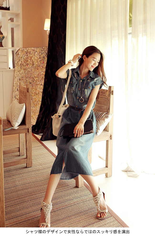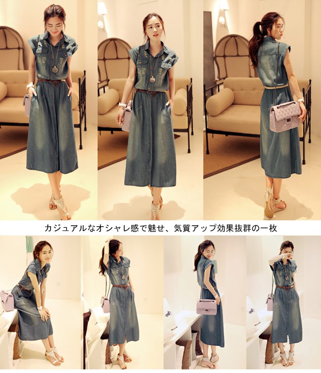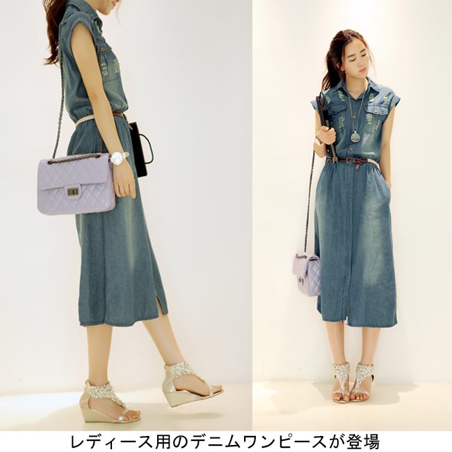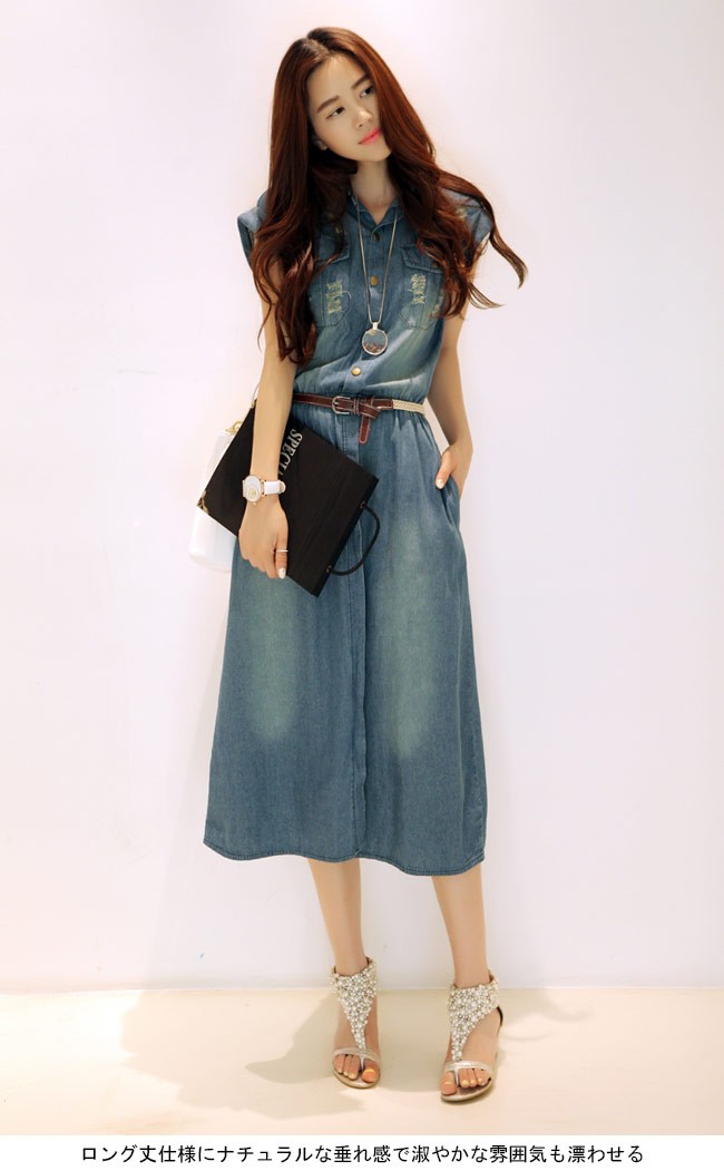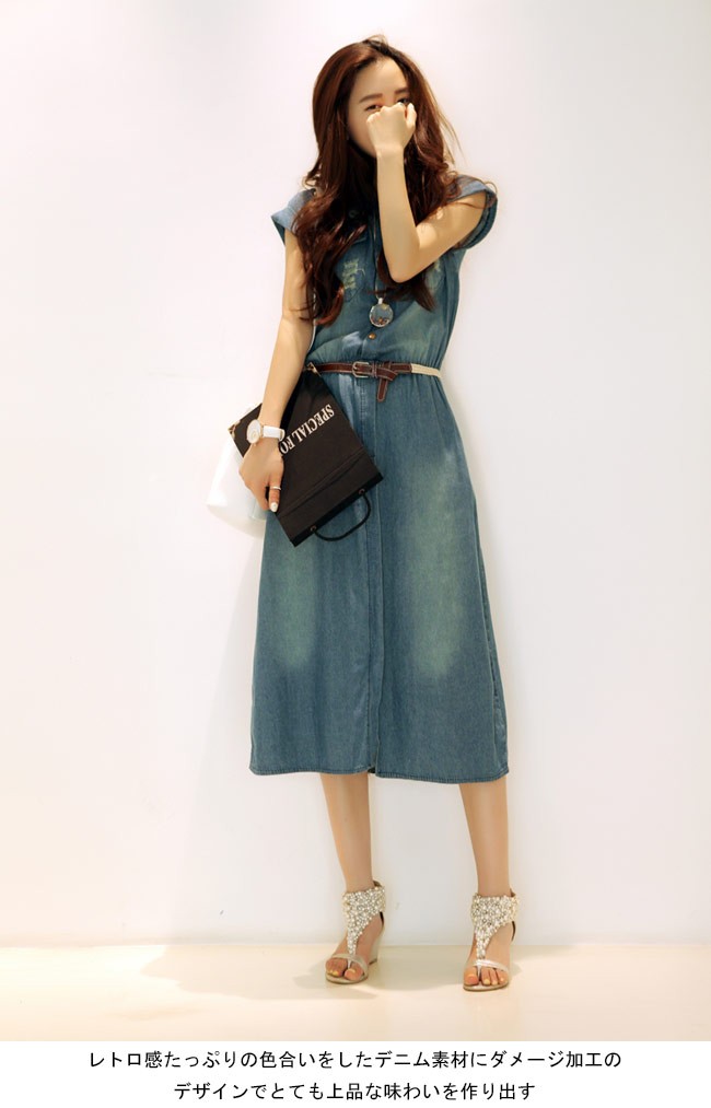 デニムワンピース ノースリーブ レディース ロングワンピ ベルト付き シャツ襟 デニム 女性用 夏物 ワンピース ロング丈 カジュアル ダメージ加工レディース用のデニムワンピースが登場シャツ襟のデザインで女性ならではのスッキリ感を演出ロング丈仕様にナチュラルな垂れ感で淑やかな雰囲気も漂わせるレトロ感たっぷりの色合いをしたデニム素材にダメージ加工のデザインでとても上品な味わいを作り出すカジュアルなオシャレ感で魅せ、気質アップ効果抜群の一枚カラー:写真色素材 綿混紡サイズ(cm) S M L XL 2XL 3XL 4XLS バスト80 ウエスト70-80 総丈110M バスト85 ウエスト75-85 総丈112L バスト90 ウエスト80-90 総丈114XL バスト95 ウエスト85-95 総丈1162XL バスト100 ウエスト90-100 総丈1183XL バスト105 ウエスト95-105 総丈1204XL バスト110 ウエスト100-110 総丈122ご注意:※サイズは平置きサイズです。素人採寸ですので、若干の誤差がございます、ご了承ください。