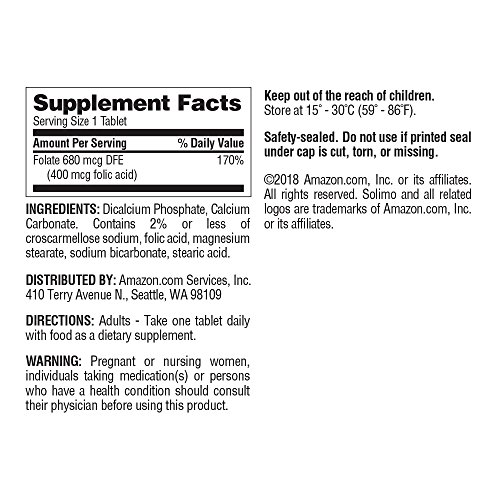 Solimo Folic Acid tablets contain no artificial colors of flavors, gluten, or lactose. Take one tablet daily with food as a dietary supplement.